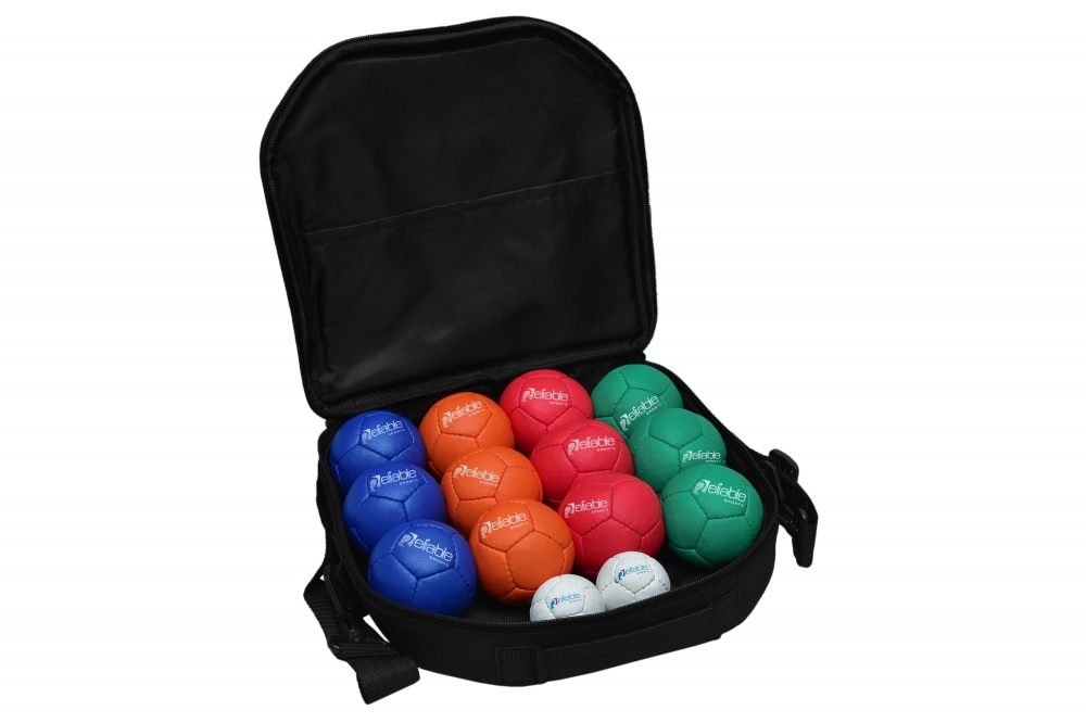 Hand stitched and made from synthetic leather and filled with plastic pellets. The Petanque balls can be used for fun or competitively indoors or outside. The sets are made up of 12 balls in 4 colours and 2 white jacks all in a carrying case
