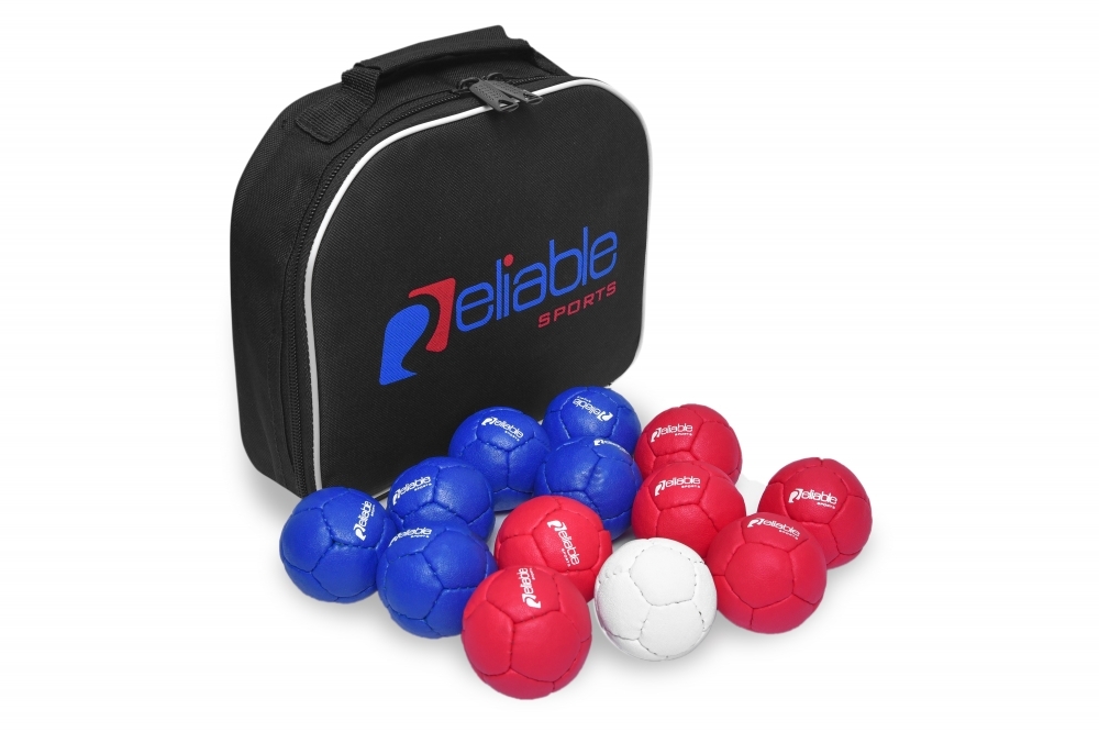 The Boccia balls are hand stitched and made from synthetic leather and filled with plastic pellets. There are 6 red - 6 blue and a white jack - all in a carrying case.